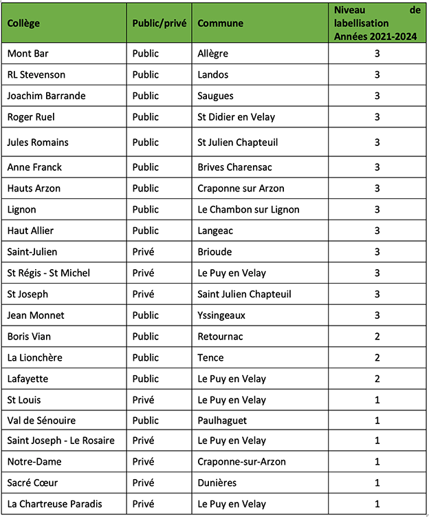 En 2023-2024 les collèges qui compostent sont : Mont Bar à Allègre, RL Stevenson à Landos, Joachim Barrande à Saugues, Jules Romains à Saint-Julien-Chapteuil, Anne Franck à Brives-Charensac, Hauts Arzon à Craponne sur Arzon, le Lignon au Chambon sur Lignon, Haut Allier à Langeac, Marguerite Thomas à Sainte-Florine et Val de Senouire à Paulhaguet. Le collège Roger Ruel à Saint Didier en Velay exporte ses biodéchets vers un site de méthanisation.